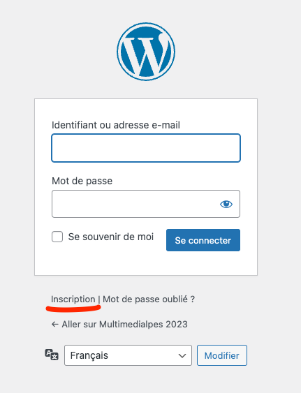 Pour voter pour le prix du public, vous devez disposer d’un compte sur le site. Si vous avez déjà un compte, vous avez juste à vous connecter, sinon vous devez créer votre compte. Pour cela vous devez aller sur l’onglet ‘CONNEXION’ du menu puis cliquer sur le lien ‘Inscription’ du formulaire (voir capture ci-contre). Une fois votre compte validé manuellement (ce qui peut prendre un peu de temps) par l’équipe du festival, vous recevrez vos identifiants par mail. Si vous êtes étudiant à l’UGA ou à l’Université SavoieMont-Blanc, seuls les comptes avec une adresse mail du type @etu.univ-grenoble-alpes.fr ou @etu.univ-smb.fr seront validés. Pour les personnels , seuls les comptes avec une adresse mail professionnelle seront validés. Les demandes de création de compte avec une adresse personnelle (de type gmail par exemple) ne seront pas validées. Une fois votre compte validé, vous recevrez un mail avec votre mot de passe temporaire.
